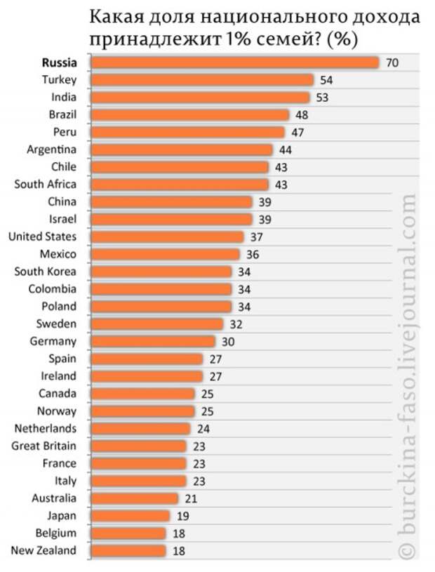 Проблема заключается в том, что в России на сегодняшний день построен самый натуральный олигархический капитализм- олигархическая Система власти феодального типа, при которой 70% национального дохода государства принадлежит лишь 1% граждан! И в этом плане мы переплюнули даже такие страны, как Турция и Индия: